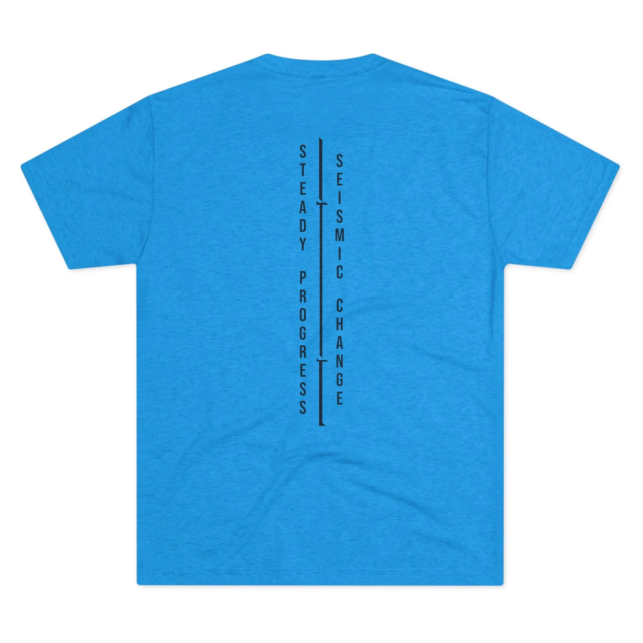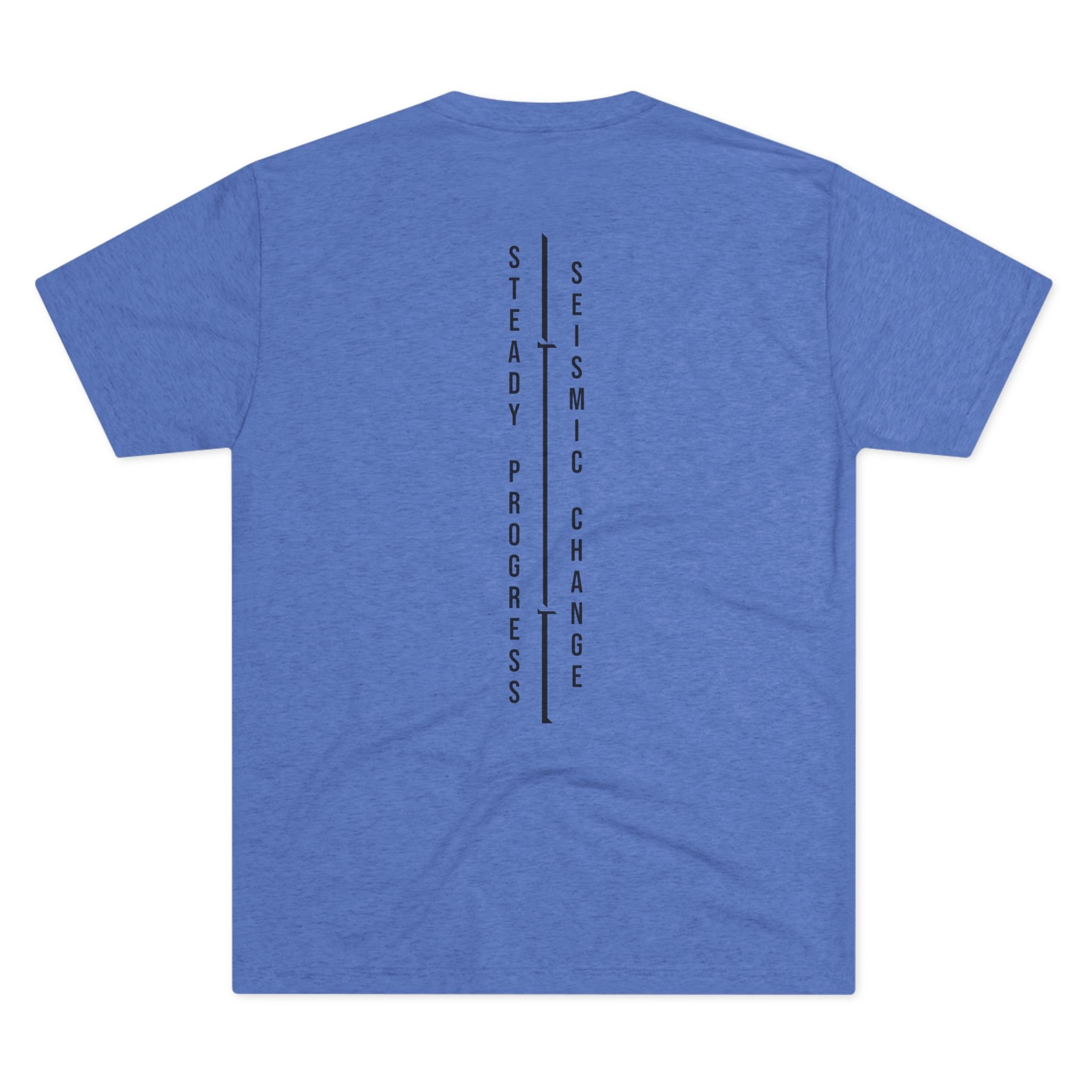 Light, breathable, and built for movement — this tri-blend crew brings understated gym style with purposeful details. A minimalist logotype sits across the chest while the back features two vertical lines of text that read like a training mantra: Steady Progress / Seismic Change. Wear it for warming up, hitting the floor, or lounging after a tough session. The soft drape and vintage heather finish feel lived-in from day one, while the structured seams and ribbed collar keep the tee aligned through reps. It’s gear that speaks to steady effort and quiet intensity — for people who measure growth in small, relentless gains.